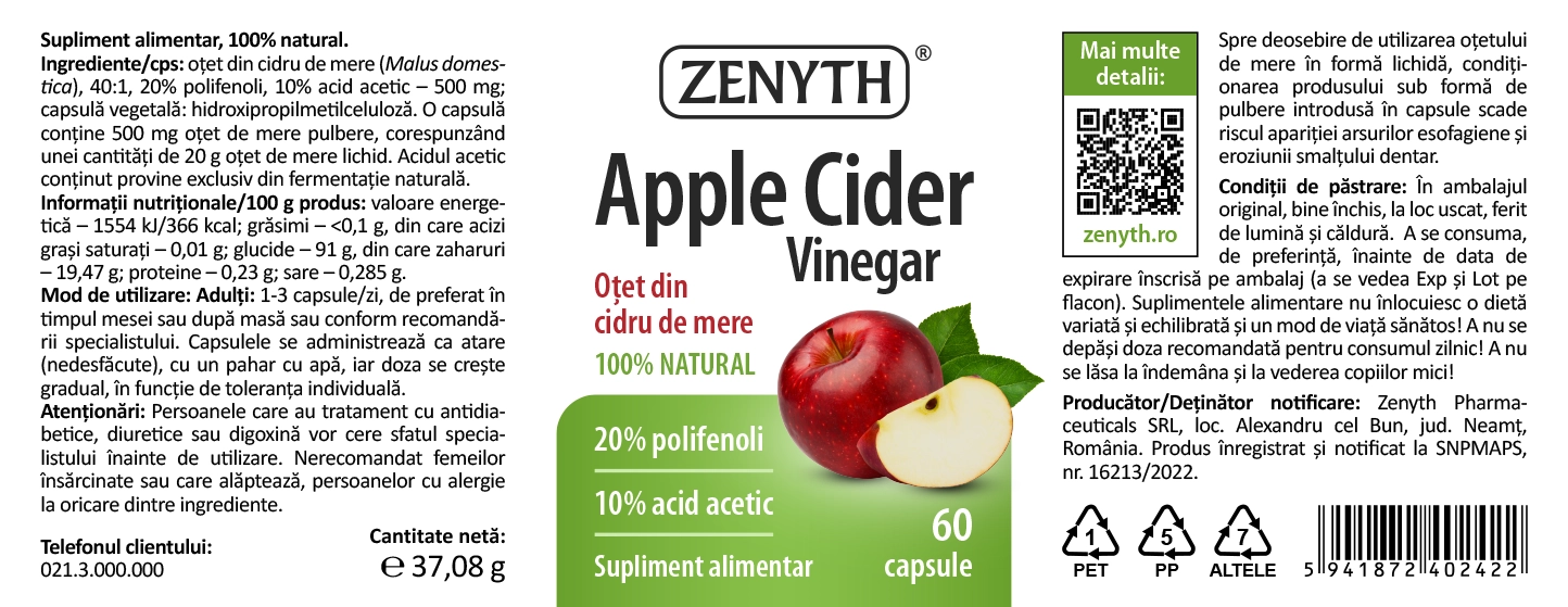 Oțetul de mere este un produs 100% natural, obținut prin fermentația sucului de mere. În primă fază, zaharurile din suc sunt transformate în alcool prin fermentație alcoolică, iar în a doua fază, alcoolul este transformat în oțet prin fermentație acetică. Ingredientul folosit în produsul Apple Cider Vinegar de la Zenyth are dublă standardizare: 20% polifenoli și 10% acid acetic. Acidul acetic, componentul majoritar din oțetul de mere, previne sindromul metabolic, reduce obezitatea și rezistența la insulină, crește producția de oxid nitric și aciditatea din tractul digestiv. Polifenolii din compoziția produsului au proprietăți antioxidante și antiinflamatorii și prezintă efecte hipocolesterolemiante, hipoglicemiante, hipotensoare, antimicrobiene și antitrombotice. Pectina din oțetul de mere este o fibră solubilă care stimulează mișcările intestinale, intensifică digestia, diminuează concentrația colesterolului în sânge, îmbunătățește starea vaselor sanguine și previne apariția aterosclerozei.
