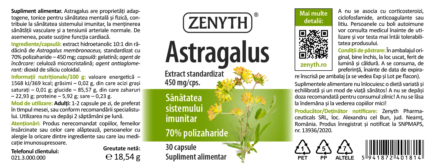 Acțiunea imunomodulatoare a Astragalusului se datorează polizaharidelor prezente în rădăcina plantei – betaglucanul și astragalina. Potrivit studiilor, polizaharidele din Astragalus pot declanșa răspunsuri imune prin efectele directe asupra mucoasei intestinale și microbiotei. De asemenea, polizaharidele promovează proliferarea și funcția celulelor T intraepiteliale intestinale, un grup de celule T specializate din mucoasa gastrointestinală care pot avea, de asemenea, efecte sistemice de modulare a imunității. Astragalus de la Zenyth conține extract standardizat cu 70% polizaharide.