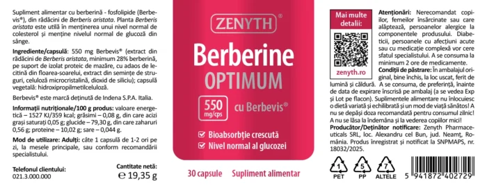 Berberina Optimum 550 mg conține extract standardizat de Berberis aristata Berbevis®, tehnologie inovatoare Phytosome®, care combină extract brut de Berberis aristata, fosfolipide din floarea-soarelui, proteine din mazăre și extract de semințe de struguri, îmbunătățind semnificativ absorbția berberinei.