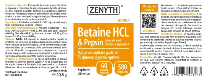 Precauții și contraindicații: A nu se administra în timpul meselor cu conținut proteic scăzut. A nu se depăși doza de 4 capsule la o masă. Contraindicat persoanelor cu hiperaciditate sau celor cu antecedente de ulcer sau gastrită cronică. Persoanele cu simptome gastrointestinale (arsuri, reflux gastric) trebuie să consulte medicul înainte de a consuma betaină HCl.