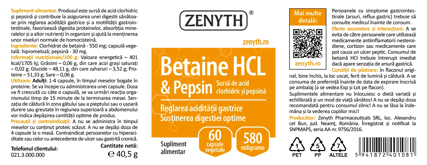 Experiența mea cu „Betaină HCL și Pepsină” este revelatoare! De ce afirm aceasta? Eu am tiroidită autoimună de tip Hashimoto, iar „Betaină HCL și Pepsină” mă ajută în procesul de digestie, fiindcă eu am o cantitate mai redusă de acid clorhidric la nivelul stomacului. Așadar, „Betaină HCL și Pepsină” suplimentează cantitatea de acid clorhidric, ce este necesar în procesul de digestie, mai ales, atunci, când consum proteine. Pepsina este o enzimă secretată de mucoasa stomacului, care transformă proteinele în peptide. Produsul „Betaină HCL și Pepsină” este unul eficient și necesar celor ce se confruntă cu hipoaciditate! Felicitări „Zenyth” pentru un produs atât de bun!!! 🙂