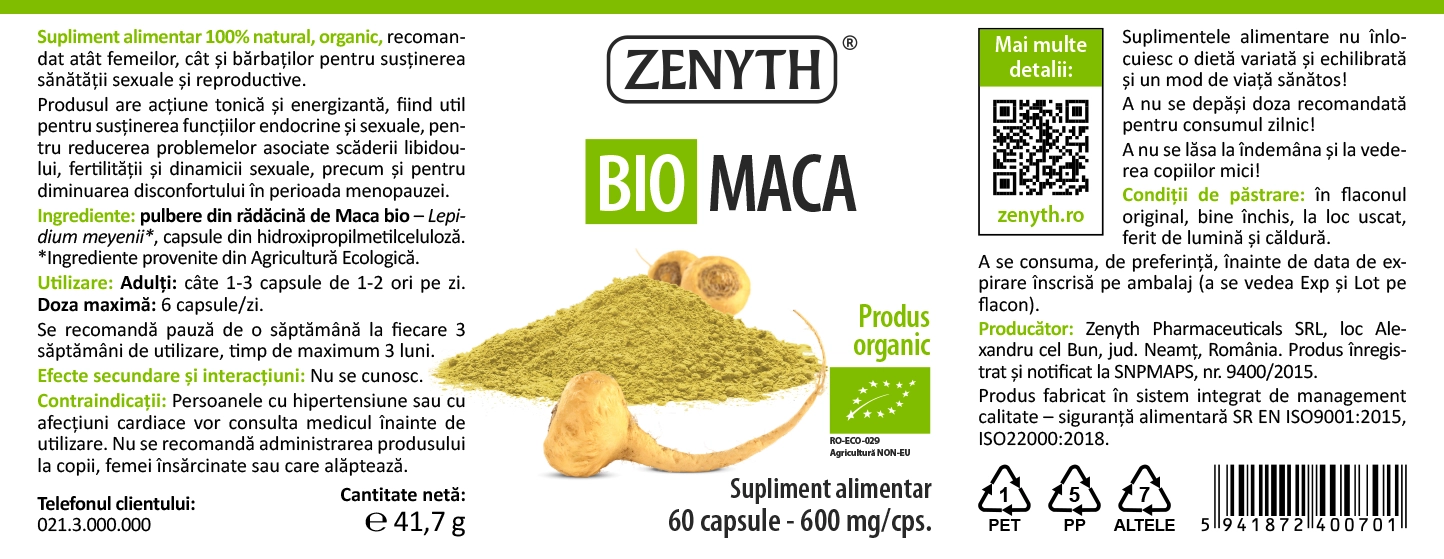 Bio Maca este un supliment alimentar 100% natural, organic, recomandat atât femeilor, cât și bărbaților pentru susținerea sănătății sexuale și reproductive. Produsul are acțiune tonică și energizantă, fiind util pentru susținerea funcțiilor endocrine și sexuale, pentru reducerea problemelor asociate scăderii libidoului, fertilității și dinamicii sexuale, precum și pentru diminuarea disconfortului în perioada menopauzei.