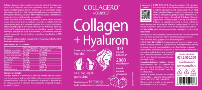 Collagen + Hyaluron este un supliment alimentar pe bază de colagen Verisol® și acid hialuronic, sub formă de pulbere. Colagenul Verisol® este un amestec de peptide bioactive, obținute printr-un proces patentat de hidroliză a colagenului de tip I și III. Colagenul este proteina constituentă a țesutului conjunctiv (piele, oase, ligamente). Colagenul intră în componența mușchilor, cartilajelor articulare, discurilor intervertebrale, oaselor, tendoanelor, organelor interne, pielii, părului sau unghiilor. Administrat intern, colagenul reprezintă o sursă concentrată de aminoacizi (glicină, prolină, lizină). Sub formă de suplimente, colagenul poate fi folosit pentru protejarea pielii, părului, unghiilor, articulațiilor, pentru refacerea după exerciții fizice intense. REȚINEȚI! Pentru a fi absorbită de către organism, molecula de colagen trebuie „spartă“ în particule mai mici. Acest lucru se face prin procesul numit hidroliză. Produsul Collagen + Hyaluron de la Zenyth conține peptide bioactive de colagen hidrolizat, care se absorb ușor de către organism.