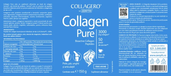 Collagen Pure este un supliment alimentar pe bază de colagen Verisol®, sub formă de pulbere. Colagenul Verisol® este un amestec de peptide bioactive, obținute printr-un proces patentat de hidroliză a colagenului de tip I și III. Colagenul este proteina constituentă a țesutului conjunctiv (piele, oase, ligamente). Colagenul intră în componența mușchilor, cartilajelor articulare, discurilor intervertebrale, oaselor, tendoanelor, organelor interne, pielii, părului sau unghiilor. Administrat intern, colagenul reprezintă o sursă concentrată de aminoacizi (glicină, prolină, lizină). Sub formă de suplimente, colagenul poate fi folosit pentru protejarea pielii, părului, unghiilor, articulațiilor, pentru refacerea după exerciții fizice intense. REȚINEȚI! Pentru a fi absorbită de către organism, molecula de colagen trebuie „spartă“ în particule mai mici. Acest lucru se face prin procesul numit hidroliză. Produsul Collagen Pure de la Zenyth conține peptide bioactive de colagen hidrolizat, care se absorb ușor de către organism.