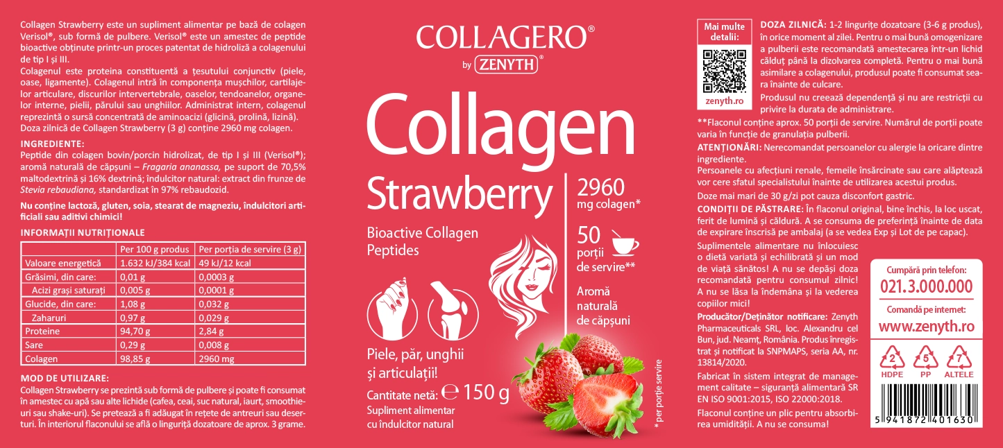 Collagen Strawberry este un supliment alimentar pe bază de colagen Verisol®, sub formă de pulbere. Colagenul Verisol® este un amestec de peptide bioactive, obținute printr-un proces patentat de hidroliză a colagenului de tip I și III. Colagenul este proteina constituentă a țesutului conjunctiv (piele, oase, ligamente). Colagenul intră în componența mușchilor, cartilajelor articulare, discurilor intervertebrale, oaselor, tendoanelor, organelor interne, pielii, părului sau unghiilor. Administrat intern, colagenul reprezintă o sursă concentrată de aminoacizi (glicină, prolină, lizină). Sub formă de suplimente, colagenul poate fi folosit pentru protejarea pielii, părului, unghiilor, articulațiilor, pentru refacerea după exerciții fizice intense. REȚINEȚI! Pentru a fi absorbită de către organism, molecula de colagen trebuie „spartă“ în particule mai mici. Acest lucru se face prin procesul numit hidroliză. Produsul Collagen Strawberry de la Zenyth conține peptide bioactive de colagen hidrolizat, care se absorb ușor de către organism.