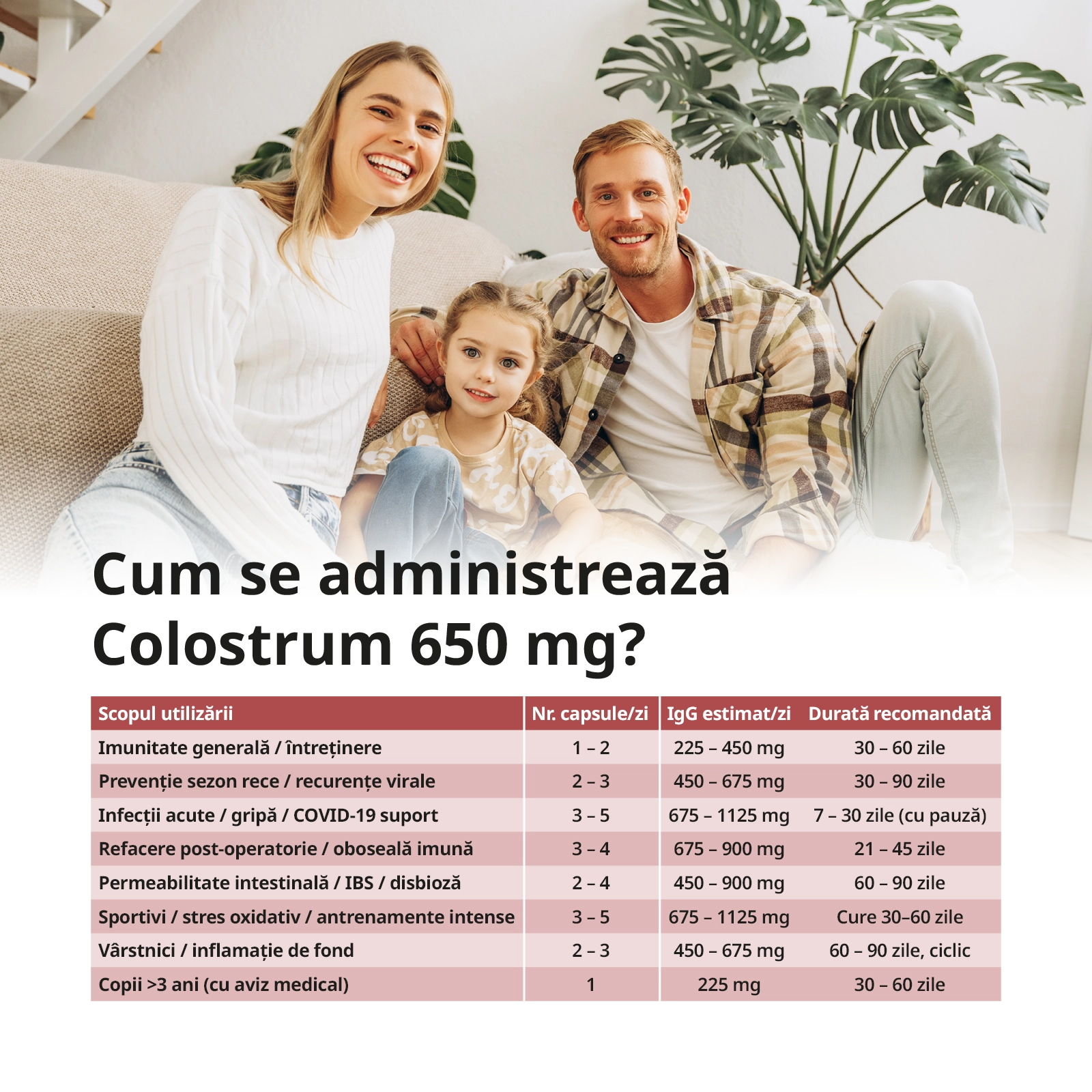 Suplimente: Colostru 650 mg + Lactoferină 200 mg + Super Vitamina D3 2000 UI
