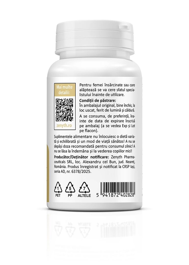 Producător/Deținător notificare: Zenyth Pharmaceuticals SRL, loc. Alexandru cel Bun, jud. Neamț, România. Produs înregistrat și notificat la CRSP IAȘI, seria AD, nr. 6378/2025.