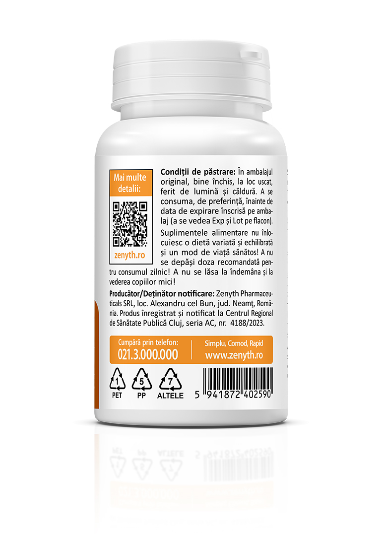 Producător/Deținător notificare: Zenyth Pharmaceuticals SRL, loc. Alexandru cel Bun, jud. Neamț, România, tel. 0233.222.203. Notificare la CRSP Cluj seria AC, nr. 4188/2023.