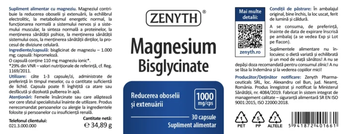 - Supliment alimentar cu 1000 mg magneziu bisglicinat/capsulă.
