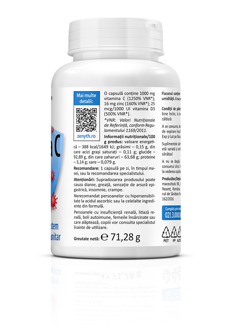 1000 mg vitamina C + 15 mg zinc + 1000 UI vitamina D3. Acestea sunt dozele per capsulă din cei trei nutrienți esențiali pentru imunitate.
