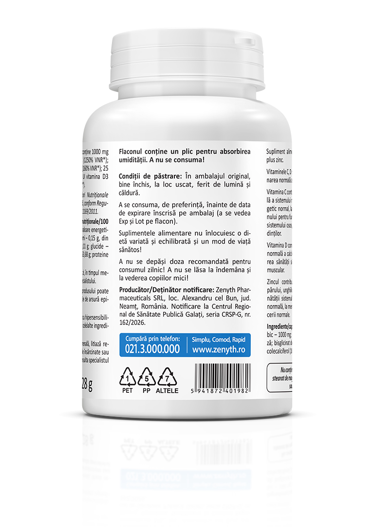 Producător/ Deținător notificare: Zenyth Pharmaceuticals SRL, loc. Alexandru cel Bun, jud. Neamț, România, tel.: 0233.222.203. Produs înregistrat și notificat la Ministerul Sănătății, nr. 4448/2020.